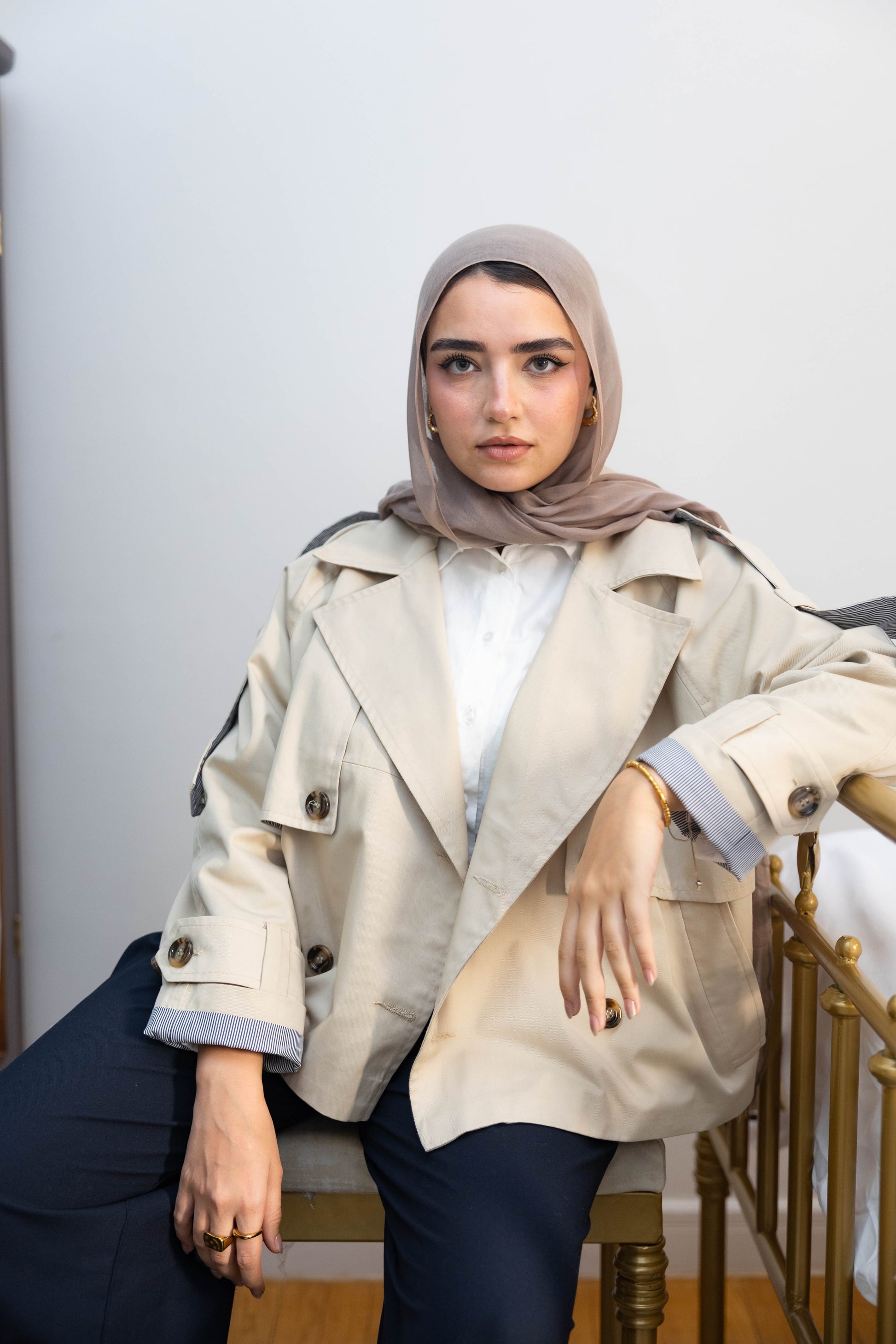 biege short trench with Double-face sleeves with shoulder and cuff panels in striped or beige.