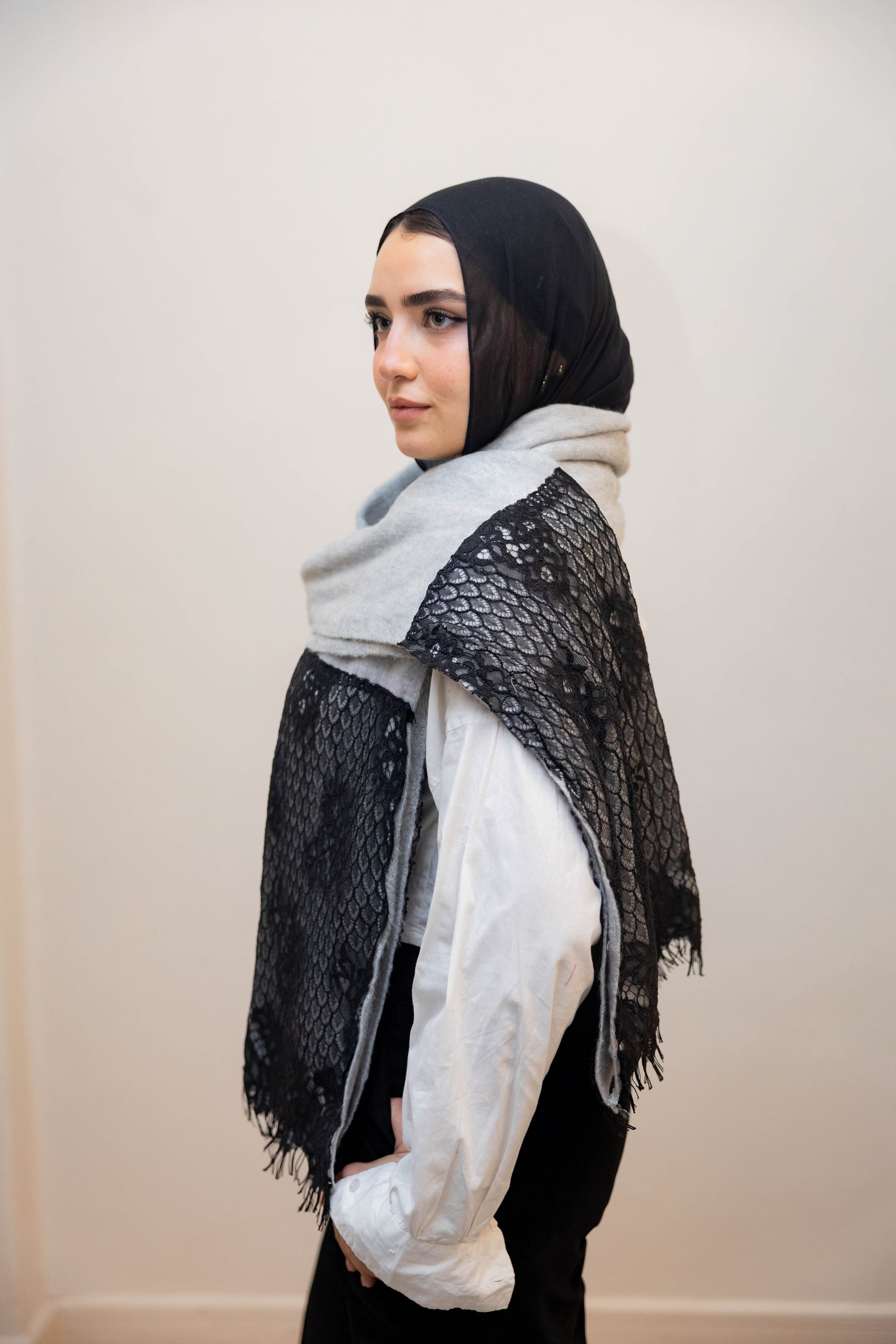 Gray Wool with black lace shawl