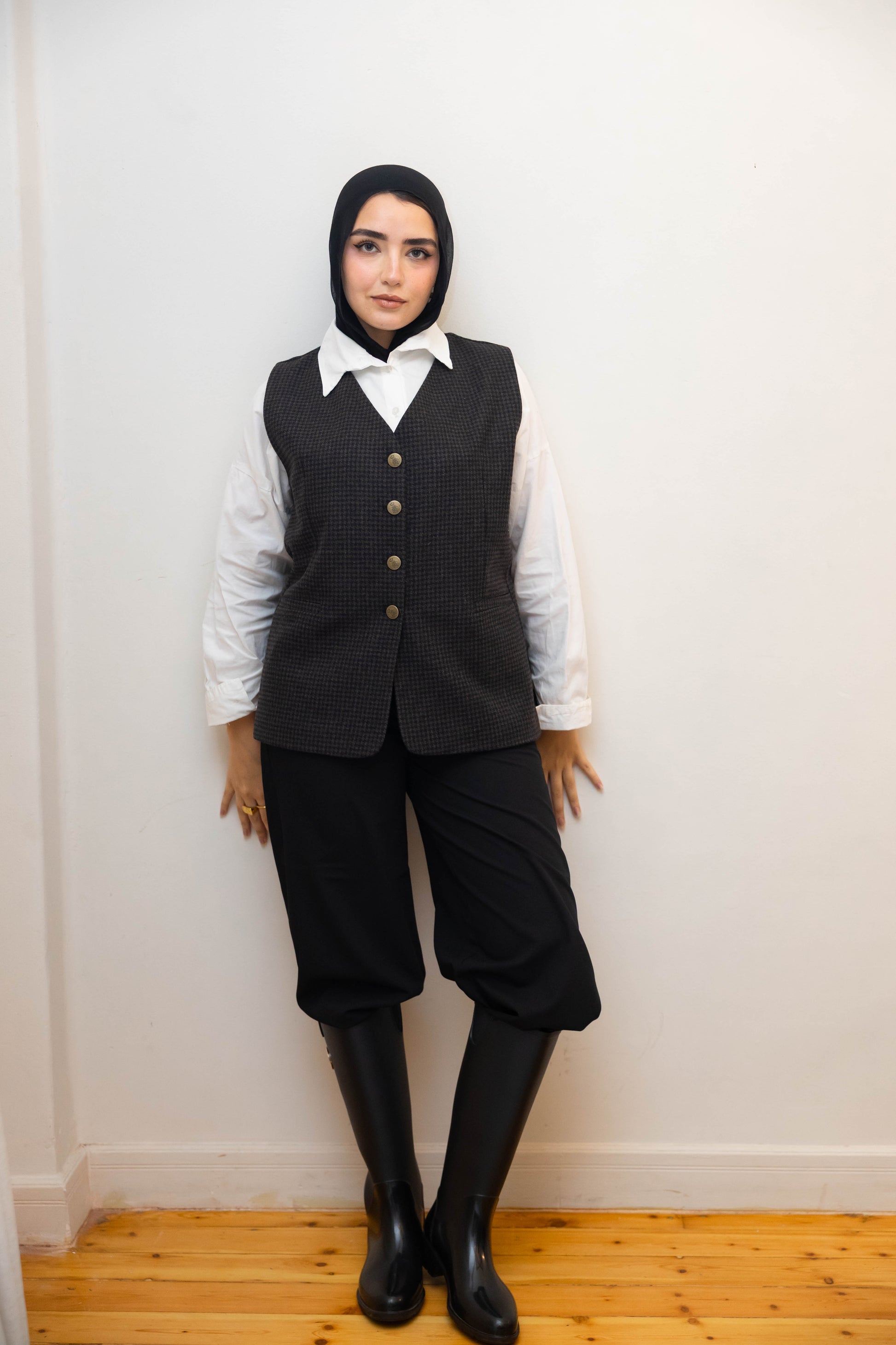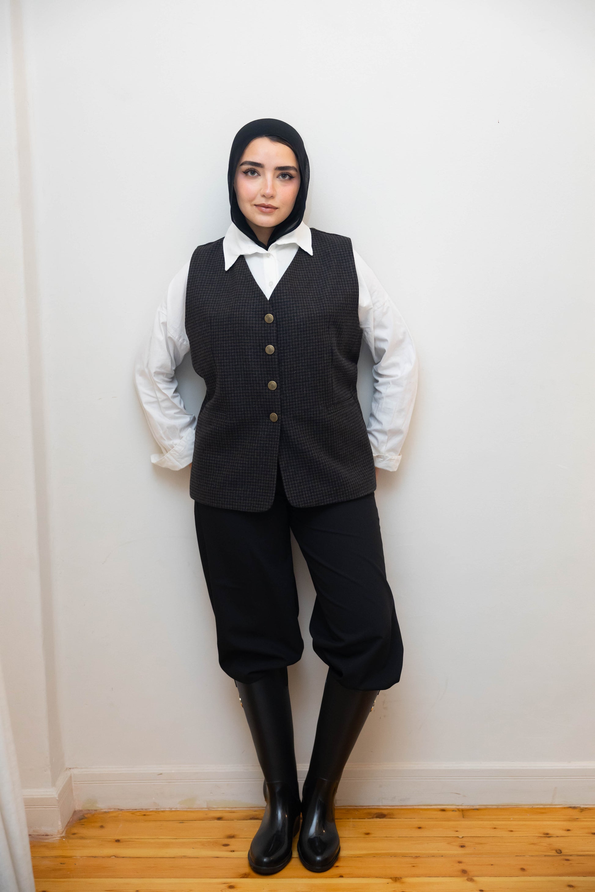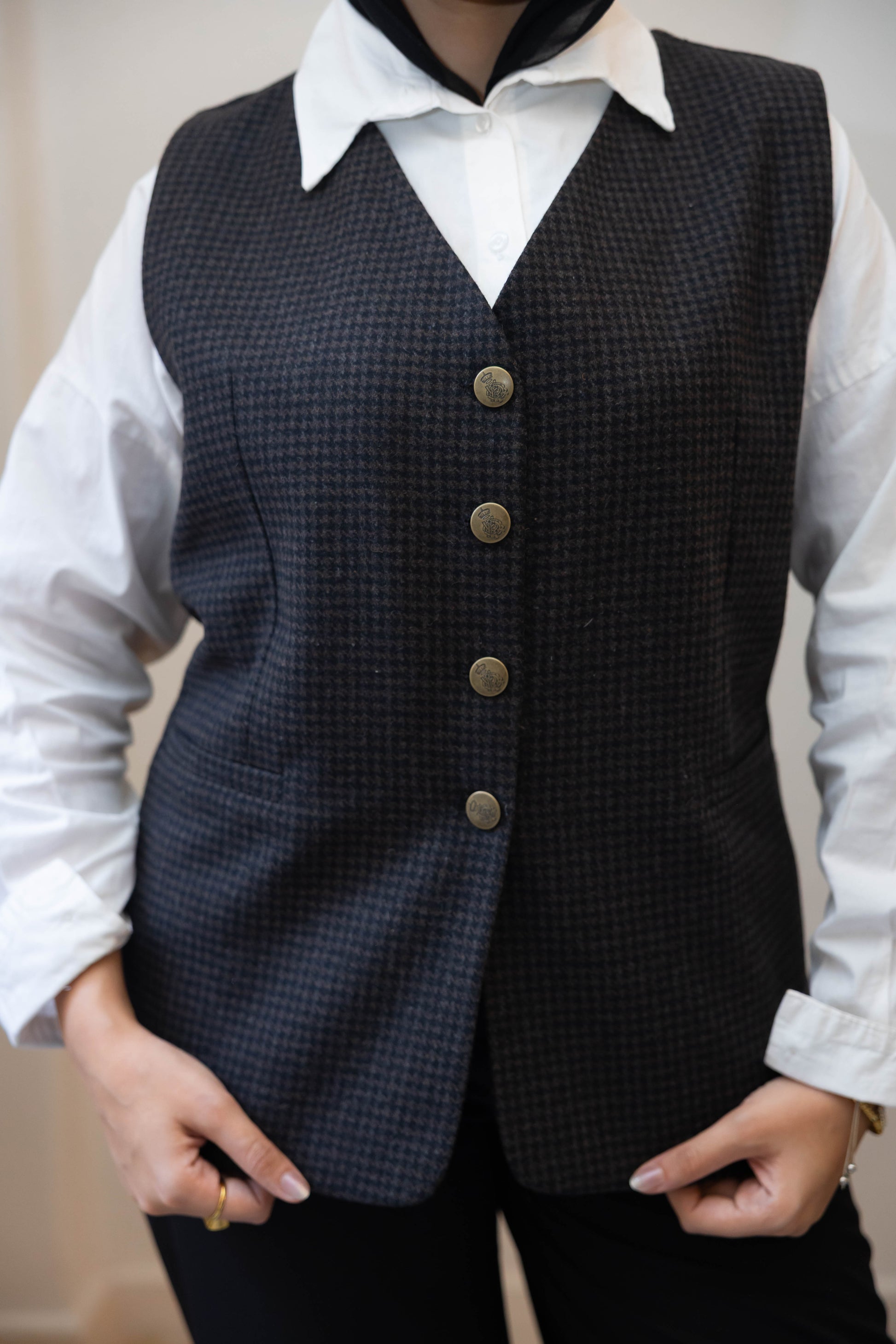 wool plaid vest with Rust-proof buttons with a vintage crown-engraved design.