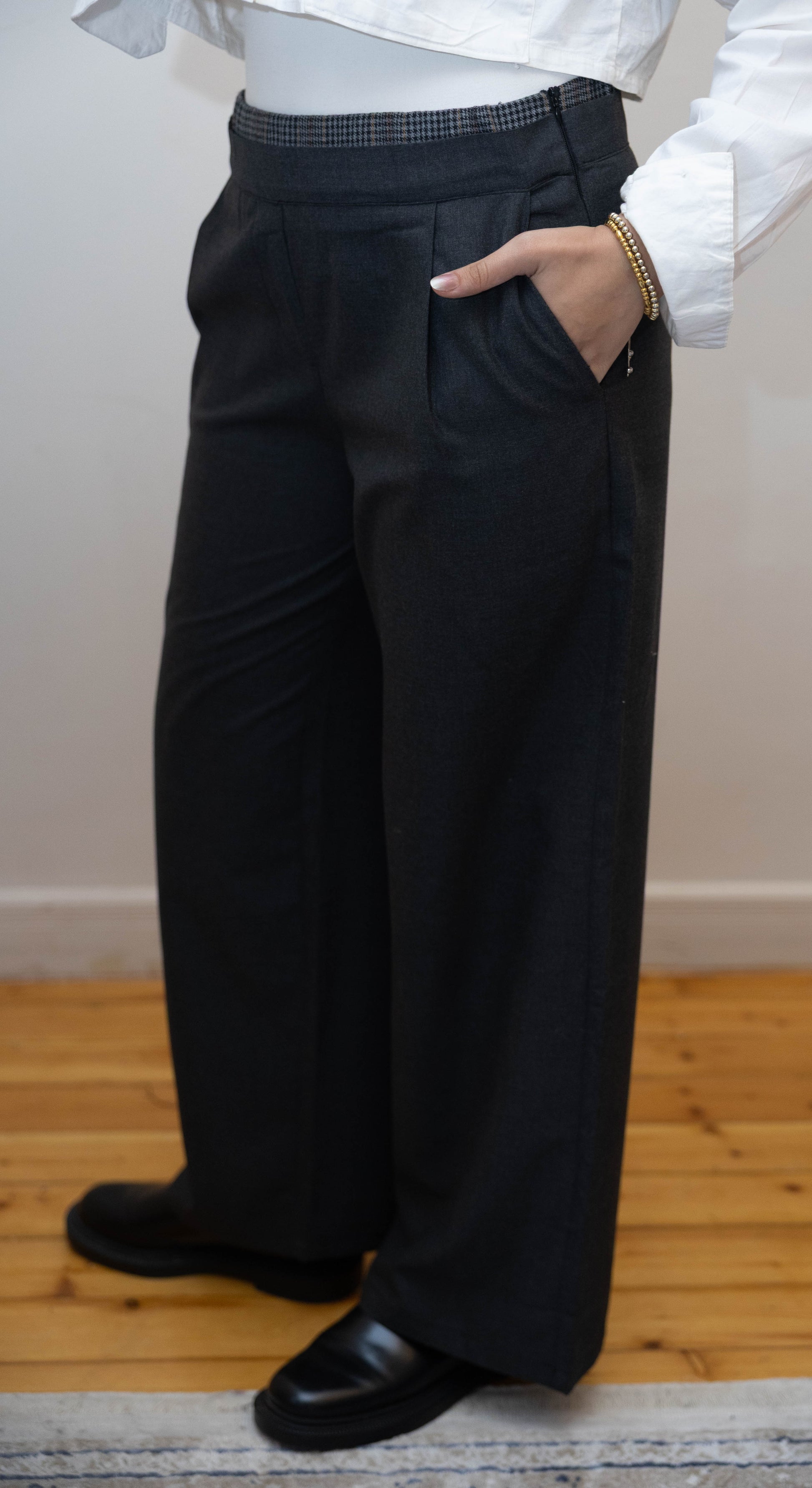 Dark gray soft wool pants , zara cut , straight wide leg with plaid fabric at the waist .